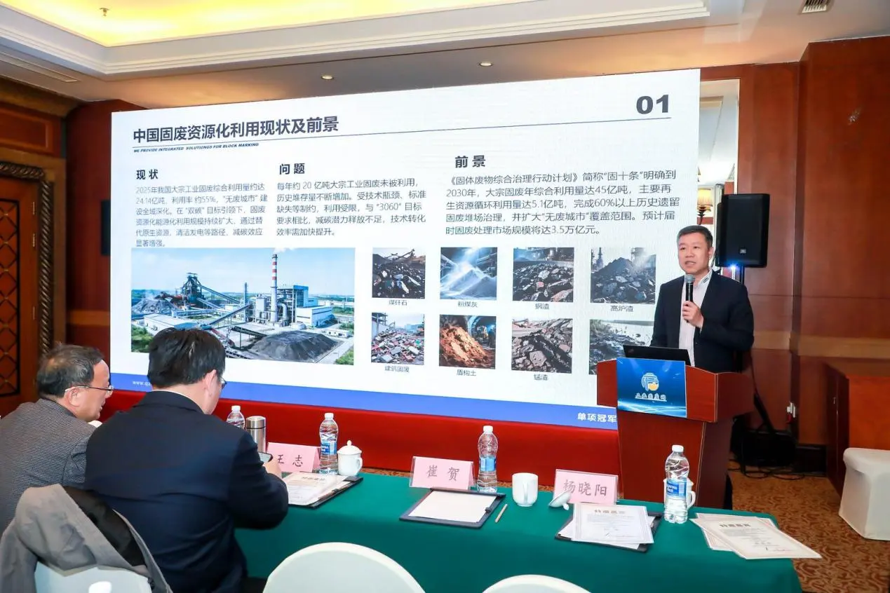 在专题报告环节,泉工股份副总经理傅国华围绕绿色智能固废制砖的研发与应用实践,详细介绍了公司在固废资源化利用、智能化制砖装备以及全流程生产管理方面的技术创新与工程落地经验。傅国华指出,泉工股份通过自主研发的高效混凝土砌块制砖机及配套自动化生产线,实现建筑垃圾、粉煤灰、矿渣等固废材料的高比例利用,不仅提升了制砖质量和生产效率,也有效推动了低碳环保建材产业的发展。